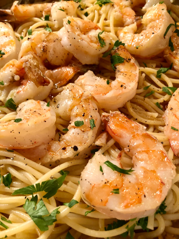This meal came together quite easily. The white wine sauce is prepared in one pan, while the shrimp are seared in another. Once the sauce and shrimp are done, the shrimp are added to the other pan and coated with the sauce. A few grinds of black pepper and a tablespoon of breadcrumbs are added to thicken the sauce. Dress the shrimp with additional olive oil and toss. Garnish with chopped fresh parsley. I didn’t add the breadcrumbs as I served the shrimp over spaghetti for a fabulous supper! The shrimp had a wonderful flavor from the garlic shallot combination. The hint of tomato paste added a little color and a bit of sweetness. Overall, a scrumptious meal.
