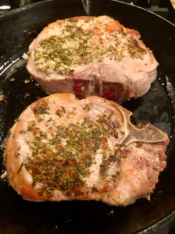 The pork chops are seared on one side in a hot pan on the stovetop for approximately 5 minutes or until brown. A quick one-minute sear on the other side; then off to the oven to bake until the internal temperature reaches 135°. The pork came out succulent with a robust flavor; they were fabulous.