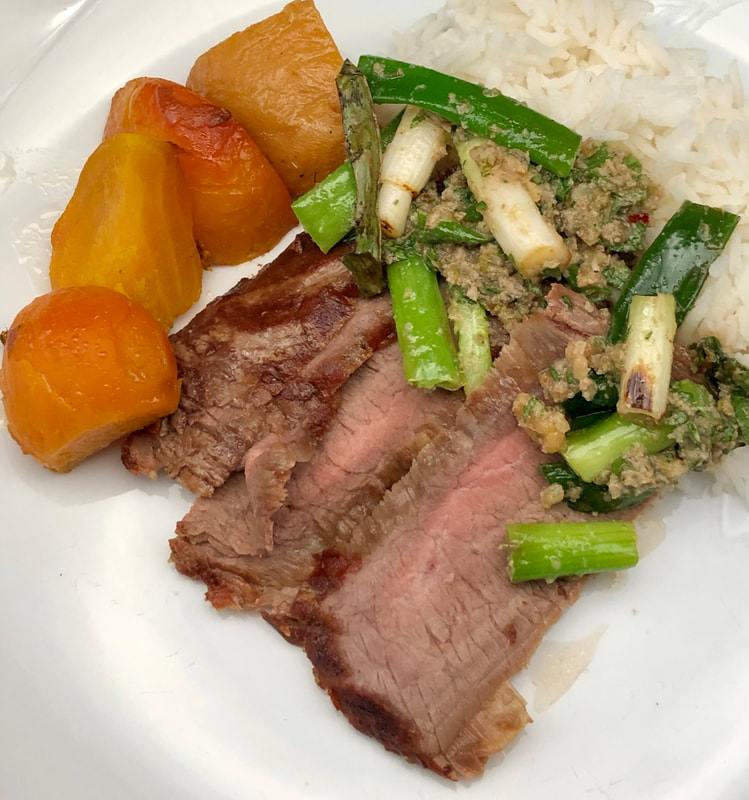 My last recipe to describe is Flank Steak with Caper-Walnut Sauce and Roasted Beets. To quote my husband, “Another restaurant quality meal!” This was found in The Wall Street Journal column “Slow Food Fast,” by Kitty Greenwald. Ms. Greenwald adapted the recipe by Chef Tomos Parry of Brat and Brat at Climpson’s Arch in East London.  The recipe serves 4-6 people and can be prepared in approximately 35 minutes.