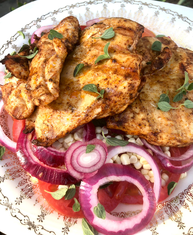 I’m still hunting down recipes that can be cooked outside on the grill. Recently, I found on The New York Times webpage, Cooking, a recipe by Ali Slagle for Grilled Chicken with Tomatoes and Corn. This quick and easy recipe needed boneless, skinless chicken thighs, extra virgin olive oil, chili powder, kosher salt, large ripe tomatoes, a fresh ear of corn, small red onion and fresh oregano.