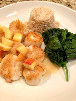 I served the scallops with brown rice and steamed, fresh spinach. While an unusually combination, the scallops with apple pan sauce was heavenly. Light, refreshing and so flavorful. I’ll admit I didn’t have two Granny Smith apples as the recipe called for, but subbing a Honeycrisp variety was perfect. The two varieties a bit similar in their flavor profile. A wonderful quick supper!