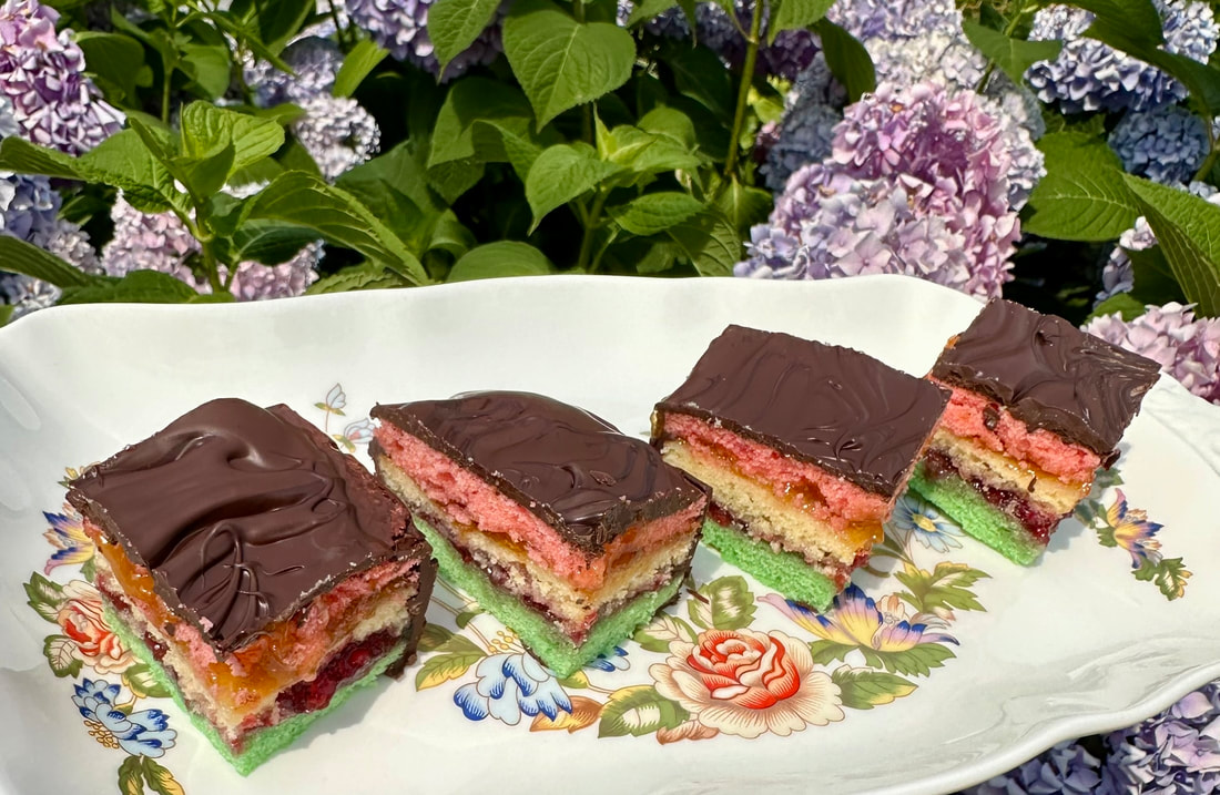 - Invert green layer; spread with raspberry jam. Add white layer; spread with apricot preserves. Top with red layer; cover set heavy pan on top refrigerate.