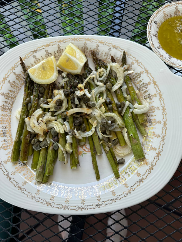Such was the case with Melissa Clark’s recipe for Roasted Asparagus with Crispy Leeks and Capers. In all honesty, I did adjust Ms. Clark’s recipe by using spring onions from my CSA box in place of leeks. Besides the ingredients named in the recipe title you’ll also need extra-virgin olive oil, kosher salt, black pepper, drained capers, lemon wedges, fresh parsley, Dijon mustard and fresh garlic.