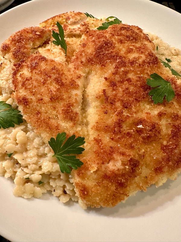 My son-in-law enjoys cooking. He recently prepared a recipe from the website “Carol Bee Cooks,” Orzo al Limone with Crispy Parmesan Chicken. Everyone in his house, except for the three-year-old who found it “too lemony,” enjoyed the dish. With this in mind, I decided to prepare it one night for my husband and I. For the chicken portion of the recipe, you’ll need all-purpose flour, kosher salt, black pepper, eggs, panko, Parmesan cheese, boneless and skinless chicken breast, olive oil and flaky salt. For the orzo you’ll need, olive oil, butter, shallot, black pepper, orzo, chicken stock, a lemon, Parmesan cheese and heavy cream.