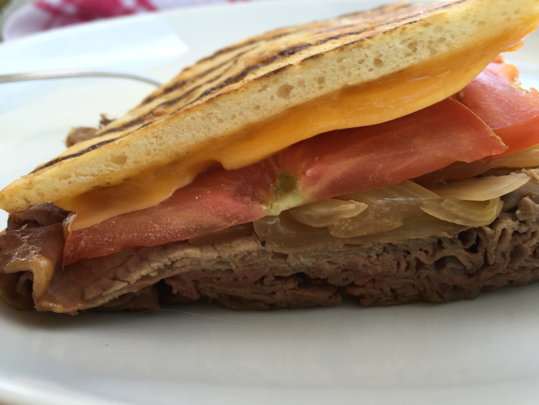 Also, since my husband won't be home for supper tonight, the cook decided to get a bite to eat from Joe Leone's in Sea Girt. Joe Leone's shares part of the Egan Liquor Store space for this branch. After searching the cases which contained pre-made salads and sandwiches, sandwiches made to order and the entrees of the day, I decided on a pre-made roast beef panini. It was a delicious sandwich. Nestled between two pieces of flat bread the sandwich was layered with American cheese on the outside, layers of tender roast beef, sauteed onions and sliced tomato. I reheated the panini in a non-stick fry pan. Daisy and I sat on the porch as I had the most delightful lunch.