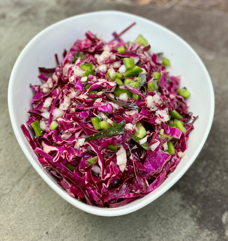 The red cabbage is finely shredded, the pepper is minced and the onion is finely chopped; then placed in a bowl large enough for tossing. In a separate bowl, the hot water is mixed with the sugar until dissolved followed by the addition of apple cider vinegar, celery seeds, salt and pepper. The liquid is poured over the cabbage and tossed and then the oil is drizzled over the cabbage and tossed again. The coleslaw needs to marinate for a minimum of two to three hours before serving. I loved this preparation; it was light and refreshing. On the other hand,….my husband likes a creamy coleslaw, however, he did like this preparation.