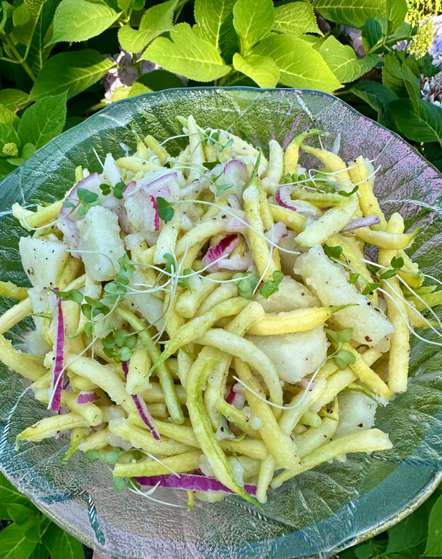 It’s the summer time and I know my husband would prefer a cold meal (after I cooked it over a hot stove) for supper. In our recent CSA box, we had a good amount of yellow string beans. I found a recipe on Lidia’s Italy website for String Bean and Potato Salad. Along with one pound of trimmed string beans you’ll need two medium to large Idaho potatoes, 3 tablespoons olive oil, 3 tablespoons white wine vinegar, 1/4 teaspoon salt, freshly ground black pepper to taste and one small red onion thinly sliced.