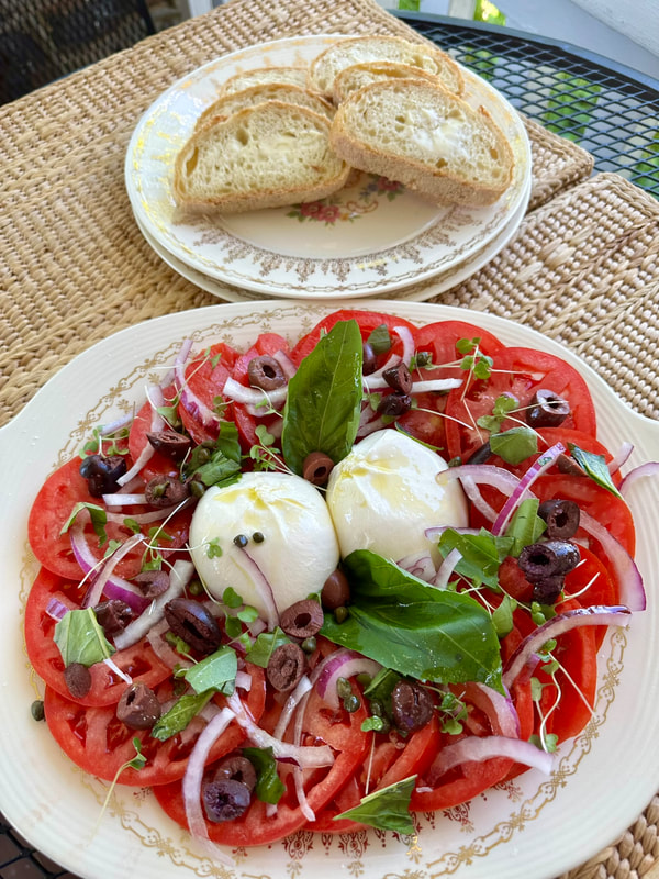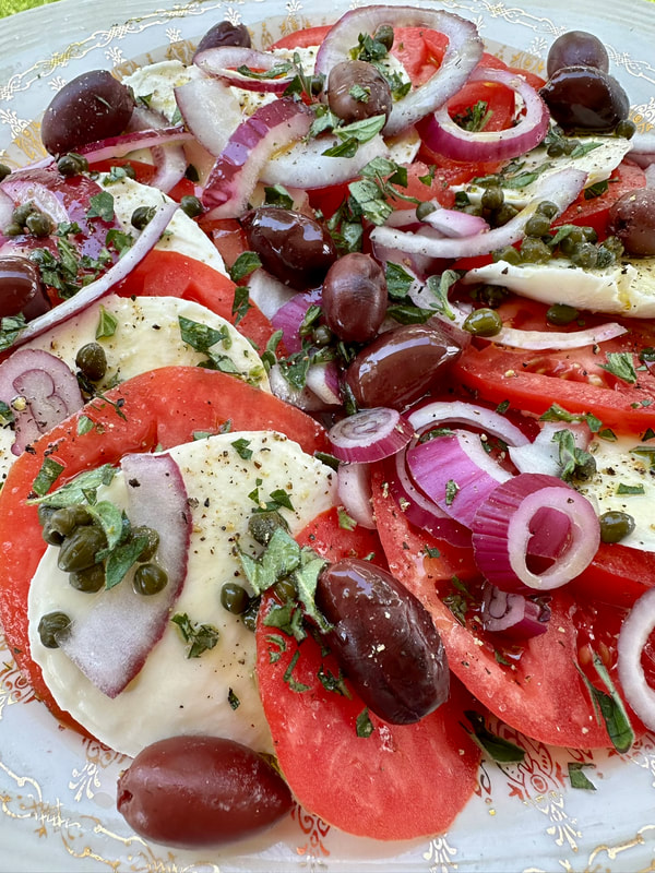 My husband sent me an image recently of a caprese salad with sliced cucumbers, sliced red onions, capers, Kalamata olives, what appears to be feta cheese and dried oregano. For my first take on this salad, I substituted fresh burrata and fresh chopped oregano. It was the first time I used burrata this way and it was out of this world. Jersey Artisan’s burrata has the richest, creamiest center I’ve ever had. The fresh oregano offered was robust with an aromatic flavor of earthiness and minty undertones. The second time I used Jersey Artisan’s fresh mozzarella and swapped the fresh oregano for fresh basil. The basil was a much better complement to the cheese with its sweet and slightly peppery undertones. What I found was the Kalamata olives I used were a bit too salty for my taste. I have a jar of Leccino olives that have mild and fruity flavors with a hint of bitterness which may taste better in this caprese.