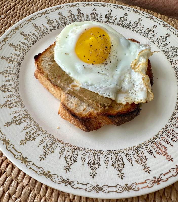 I started by toasting the bread on my outdoor grill then rubbing the toasted bread with a garlic clove to infuse more flavor into the bread. Using dental floss, I carefully sliced several slices of pâté and placed it on the bread. I fried a runny egg and placed it on top. Some salt and pepper on the egg and voilà you have yourself a delicious meal. My husband is always game to try new dishes and he was impressed with this one. It’s great for a fancy breakfast or brunch with friends; the best part, it’s so easy!