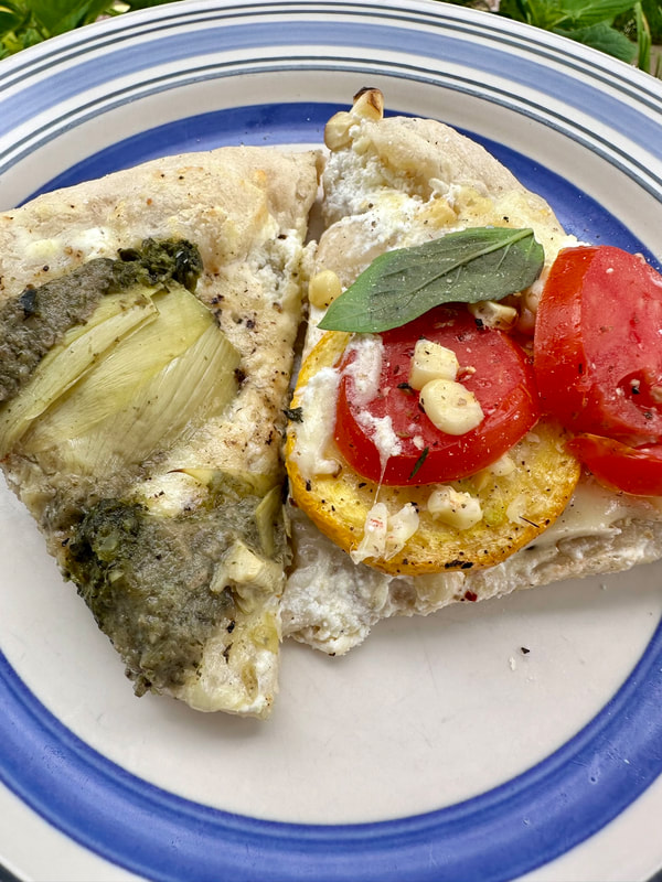 For the Mushroom and Artichoke pâté, I upped my pizza game and used it as a topping. I make my own pizza dough, but now I’m letting it ferment for 24 hours in my refrigerator before using. Also, I cook my pizza right on my Weber gas grill grates to achieve a nice brown and slightly charred bottom. After stretching out the dough on a pizza peel, I topped it with a schmear of whole milk ricotta cheese, followed by lots of finely grated Pecorino Romano cheese, whole milk mozzarella, sea salt and freshly ground black pepper. Just before I was going to pull the pizza off the grill, I added thinly sliced pâté. To slice, I lay the pâté flat on a cutting board and with a long, thin serrated knife, slice it parallel.