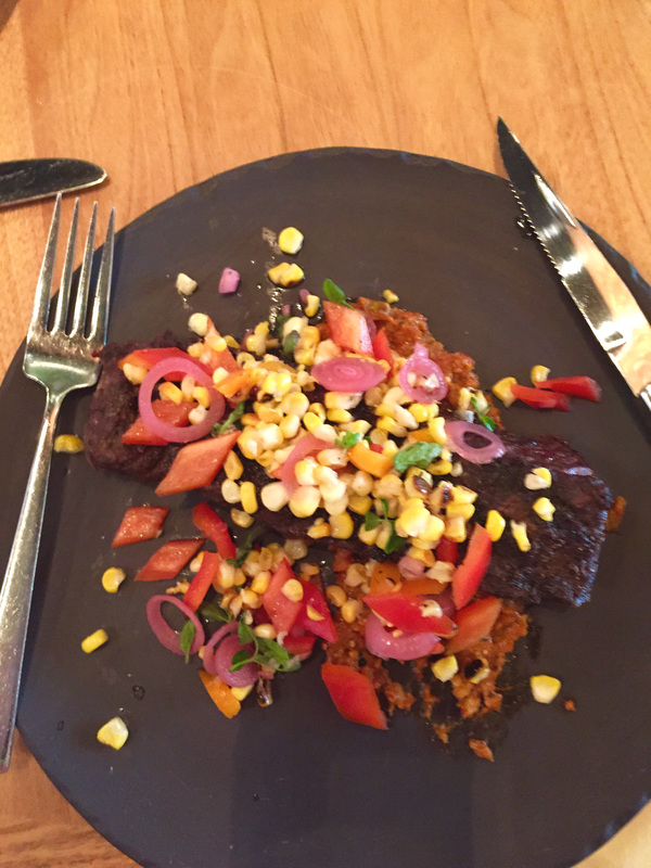 Today we went for the Restaurant Week lunch menu. I started off with the Stone Fruit Sangria and my husband had an Arnold Palmer, with a shot of bourbon. Our appetizers were strawberry gazpacho watermelon, tomato and fresh goat cheese and I had local burrata peach salsa verde and basil panzanella. For a main course I had grilled bavette (hanger steak) tomatillo romesco, which had some kick to it and my husband had Scottish salmon cucumber, avocado and dill. Both were excellent! To complete our lunch we had peach basil sorbet honey poached peaches and summer berry and passion fruit tart. Both desserts had seasonal fruit at the peak of ripeness.
