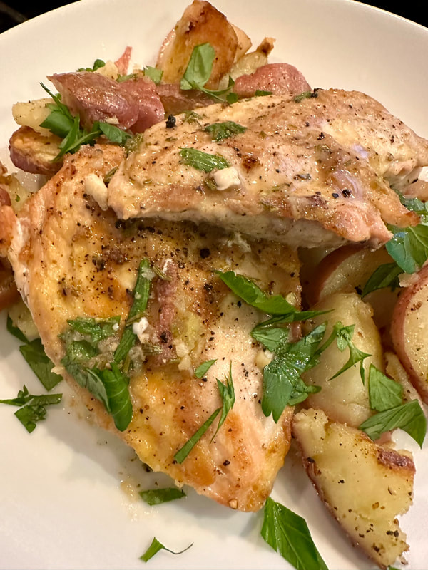 The next recipe is from the late Michael Chiarello’s cookbook “The Tra Vigne Cookbook - Seasons in the California Wine Country.” Chicken with Roasted Lemon and Rosemary is such a wonderful recipe, whether for a weeknight meal or for guests, it’s an easy to prepare dish, but does have a few steps. For the recipe you’ll need red bliss potatoes, large lemons, extra-virgin olive oil, kosher salt, freshly ground black pepper, boneless chicken breast halves (skin on), fresh garlic, double-strength chicken stock, freshly chopped rosemary, finely chopped flat-leaf parsley and unsalted butter (optional).