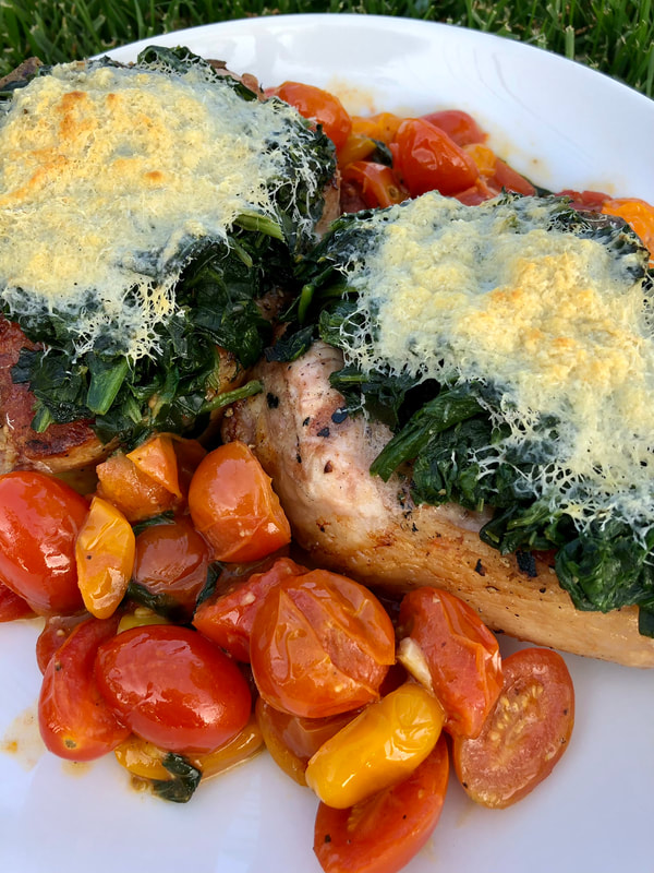 I grilled the pork chops outside just shy of an internal temperature of 145°. While they were grilling, I prepared the spinach. I used frozen spinach that I had on hand. Per the recipe, I sautéed with the olive oil and garlic and seasoned with salt and pepper. In another pan, the tomatoes are sautéed with garlic, olive oil then seasoned with salt, pepper and fresh basil leaves.