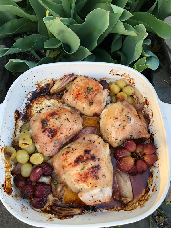 The chicken recipe called for chicken thighs, fresh garlic, za’atar (optional), shallots, red and green grapes in small clusters on the vine and fresh thyme. My husband and I found the dish very good and tasty. However, he would have preferred the grapes off the vine, making it easier to eat them. Also, his preference would have been for chicken breasts. The roasted grapes were delicious with the chicken. Leaving out the za’atar was a mistake on my part. I thought the chicken could have used a bit more seasoning, but I didn’t want to purchase this spice just for one dish. Za’atar is a Middle Eastern spice blend that could include dried oregano, marjoram or thyme, spice such as cumin and coriander along with sesame seeds, salt and sumac. Sumac is a bush with dried fruits that are crushed to make a red powder. Sumac is bright in color, tart and lightly astringent. However, I am seeing it being used in a few more recipes that I am looking to try.