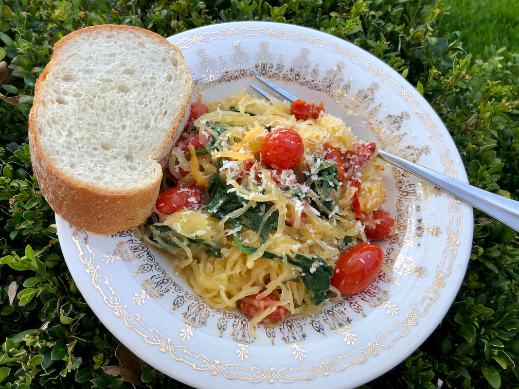 Spaghetti Squash with Tomato, Spinach, Garlic and Pine Nuts