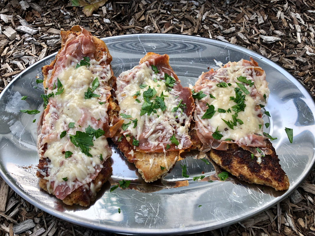 This dish is an egged and breaded veal cutlet that is fried, topped with thinly sliced prosciutto and shredded Parmesan. I used the recipe from the website La Cucina Italiana as a guide, adapted it to be closer to Chef Fabio’s creation, and substituted pork tenderloin.