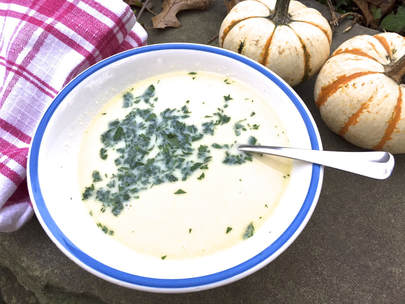 Many years ago, Delicious Orchards featured a soup befitting Indian summer, it's cream of cauliflower soup. The soup is quite easy to prepare. You’ll need 5-6 cups of chicken stock and three cups of milk, light cream or heavy cream. In the past I used to use heavy cream, however, becoming more health conscious, I opted for whole milk as I wanted a creamy taste, but with less fat. For this preparation I used Organic Valley whole milk that I purchased at Whole Foods for $2.99/quart. The cauliflower was from Delicious Orchards and costs approximately $2.99 per head.