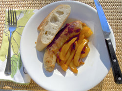 However, there is still supper to be made. I went to Whole Foods to pick up some bone-in chicken breasts for which I had a rain check. The chicken was on sale last week for $2.49/lb., however, by the time I got there they were out. So today I picked up a package of that, but noticed that they had Italian flavored chicken sausage on sale for $3.99/lb. I selected sweet sausage. Further inspiration came to me when I saw that they had California red or yellow field peppers on sale for $1.49/lb. The yellow peppers seemed a bit soft, but I found two I liked. Supper decided, chicken sausage and peppers. I also purchased their baguette artisan bread loaf for $2.50 to go along with the meal.