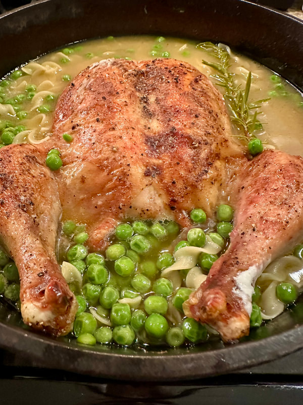 I was at a loss one day as to what to prepare for supper. A roasting chicken is great for weeknight meal for two, especially since the chickens these days average about three to four pounds, which means sometimes two meals out of one recipe. Clare deBoer, chef/owner of King in New York City and Stissing House in Pine Plains, New York created One-Pot Creamy Chicken and Noodles, which is a perfect meal for this week’s chilly weather. My description of this recipe is a chicken that’s roasted with beautiful burnished skin, then poached in water, creating a chicken stock to which egg noodles are added and finished with sour cream to create a creamy sauce. The broth is quite flavorsome from the addition of a head of roasted garlic, Parmesan rinds and fresh rosemary.