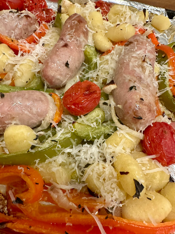 The recipe starts by mixing a dressing of olive oil, garlic, oregano, salt and chili flakes and tossing together the gnocchi, onion, peppers and tomatoes. These ingredients are placed on a rimmed baking sheet. The sausage is nestled into the vegetables. The ingredients roast in a 425° oven for approximately 40 minutes or until the sausages are cooked through and the veggies and gnocchi are golden. To serve, the dish gets a shower of grated Parmesan and basil.