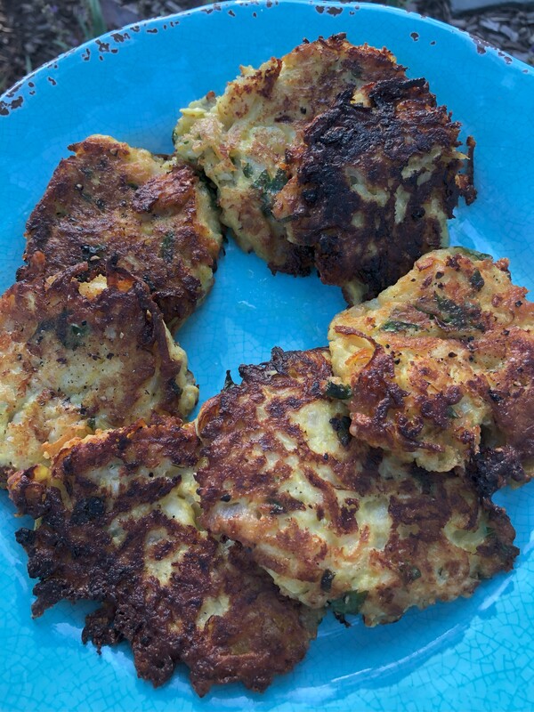 Using a box grater, I shredded both the squash and onion and set it in a colander. I sprinkled it with salt to help extract the moisture. You must allow 30 minutes for the salt to pull the moisture from the vegetables. In a large bowl, add the zucchini, onion, dry ingredients, a lightly beaten egg, salt and pepper; mix until just combined. Add neutral oil to a skillet and adjust heat to medium. Once the oil begins to shimmer, drop heaping tablespoons into the skillet, slightly flatten and cook until golden brown. Turn and cook the other side until brown.