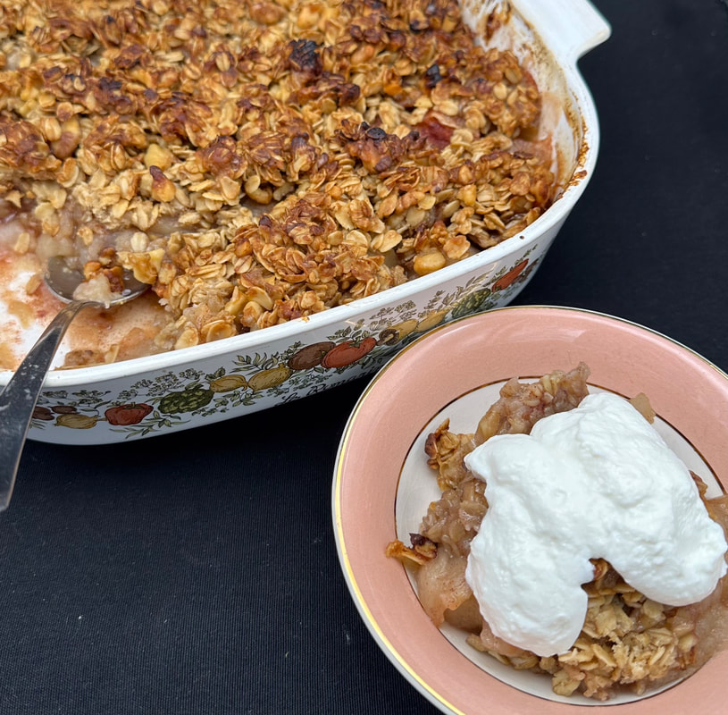 The apples are cut into chunks and tossed with lemon juice, sugar, cornstarch, cinnamon and a pinch of salt. The topping is made with melted butter, honey, oats, flour, almonds, coconut and a pinch of salt. The apples are placed in a 9x13-inch baking dish and covered with the oat mixture and baked for 45 to 55 minutes.