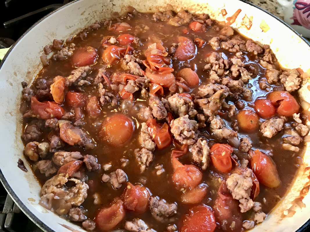 Start by bringing a large pot of water to a boil for the pasta and lay out your measured ingredients. To prepare the sauce, add olive oil to a large skillet and crisp the guanciale. Once done, the rendered fat is removed and saved, minced onion is added and cooked until softened. Next, the sausage meat is browned. Using Lidia Bastianich’s method, I cleared a spot in my skillet and added the tomato paste to cook for approximately one minute. Whole cherry tomatoes are added to the pan, followed by wine. The pan is covered with a lid and cooked for 5 minutes. Remove the lid and using the back of a wooden spoon, or as I did, a potato masher, break the tomatoes and cook uncovered for an additional 5 minutes.