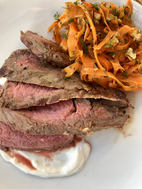The steak can be grilled or cooked under your oven’s broiler. I cooked my steak outside on the grill to medium rare and allowed it to rest before slicing. Unfortunately, this preparation didn’t light up our tastebuds. The meat wasn’t as tender as one would hope. In fact, my husband wondered if I had cut it properly, that is, cutting across the grain; I had. When I mentioned the yogurt dressing, I was met with skepticism and refusal. The carrot salad wasn’t his favorite either, I particularly enjoyed it as it was different and the dill added such a nice flavor against the slight tart dressing and sweetness of the carrots. When I read the comments by other cooks, the recipe received favorable reviews. One cook used a flat iron steak, which sounds like a good idea