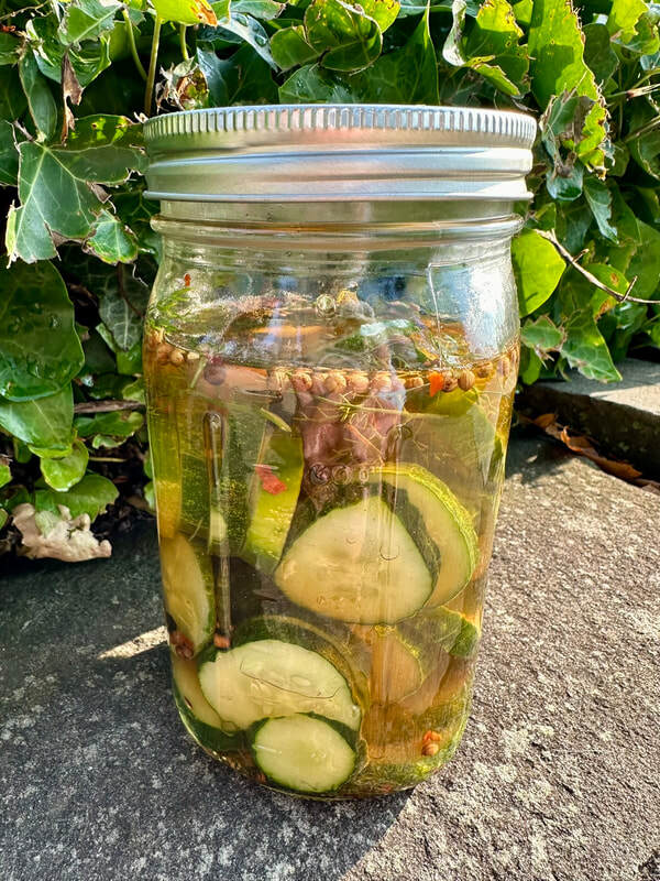 I sliced my Kirby cucumbers into discs using my mandoline. Into a sauce pan I combined the vinegar, water, garlic, salt, sugar and spice and simmered until the salt and sugar had dissolved. The sliced cucumbers were placed into a quart mason jar and the strained cooled liquid was poured on top. I used a spoon to add some of  the spices and garlic cloves. I was a little shy of covering the cucumbers so I added more vinegar. Once the liquid cooled, I covered the jars and refrigerated. Although it was recommended to wait 24 hours before eating, curiosity got the better of me and I had to give them a try. These were delicious and very flavorful. The use of apple cider vinegar and combination of spices added a lovely dimension to the taste of the pickles; a winner recipe.