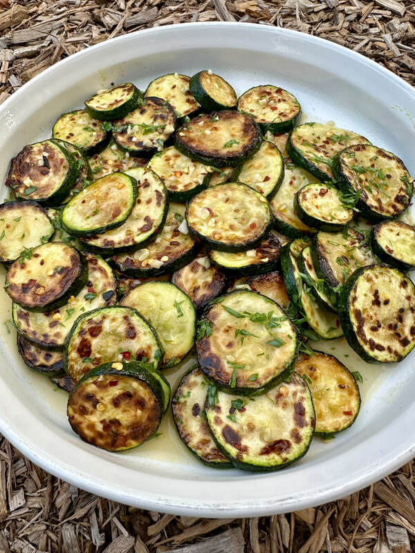 Using my mandoline, I made 1/4-inch thick rounds, salted them and placed them in a colander for 30 minutes to draw out the excess moisture. Once done, I patted them dry with a towel and cooked them in a shallow skillet with some oil until one side was a deep golden brown. The zucchini is removed from the pan, placed on a plate to which I sprinkled some finely chopped garlic and a dash of red pepper flakes; I did this in two batches. Once the zucchini was done, white wine goes in the pan to deglaze and reduce by half. Lastly, a little butter and lemon juice is added to create a sauce. The sauce is poured over the zucchini along with a dusting of chopped tarragon from my herb garden. What a tasty side dish that was done in under 30 minutes.
