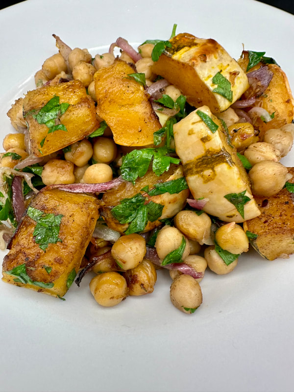 The squash is cut into 1-inch cubes tossed with the oil, garam masala (which I used), salt, thyme and red pepper flakes for 20 minutes. While the squash is roasting, the chickpeas, red onion, more seasoning, salt and olive oil are tossed together. They are then added to the pan of squash, combined and roasted for 30 minutes.