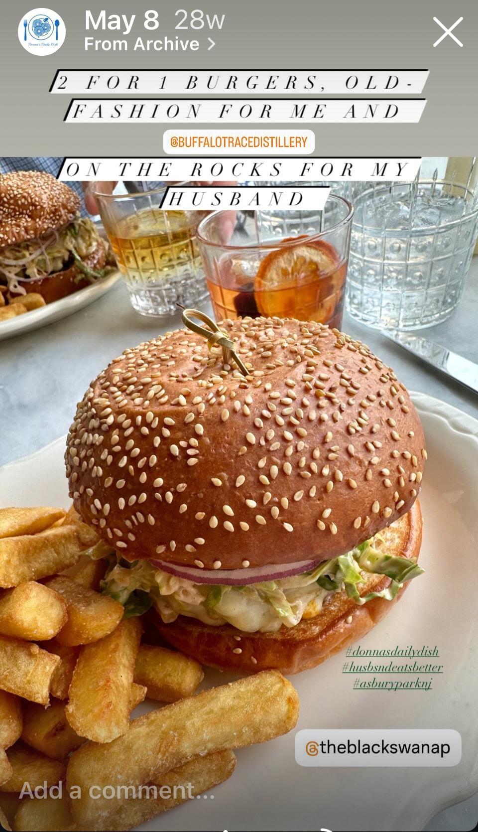 If you’re looking for a simple meal out with great food you should try Black Swan Public House in Asbury Park, NJ. On Wednesday evenings they offer 2 for 1 burger. You get a burger topped with muenster cheese, onion, lettuce, pickles, Marie Rose sauce on a sesame seed bun along with steak fries ($25). If you’re like my husband and I, get there before 6 PM and enjoy 50% off all alcohol (except bottles of wine). Dinner for two including alcohol beverages (I love an old-fashioned with Buffalo Trace bourbon) costs us about $60 before tax and tip.  On Thursday night they offer several pasta dishes for $25 with a wine special. We haven’t try this yet.