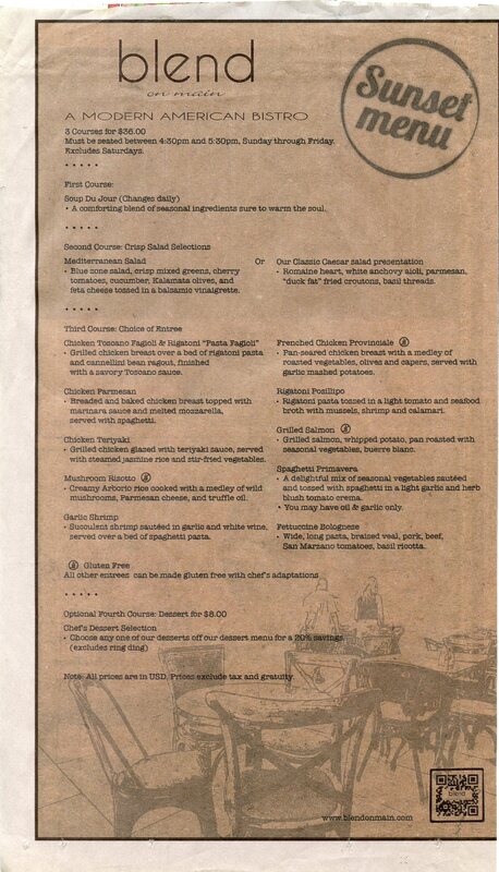 Earlier this fall, Blend on Main* in Manasquan had a half page ad with the specials they were offering. Sunday through Friday (excluding Saturday), they have a sunset menu priced at $35 for three courses. You must be seated between 4:30 and 5:30 PM. If you’re a “senior,” they offer 10% off the dinner menu Sunday through Thursday (not combinable with other specials). Prime rib night is every Thursday from 5-8:30 PM. Are you an early riser that likes to enjoy breakfast out? Blend’s Peach Pit Cafe offers 20% discount on breakfast before 9 AM Monday through Friday.