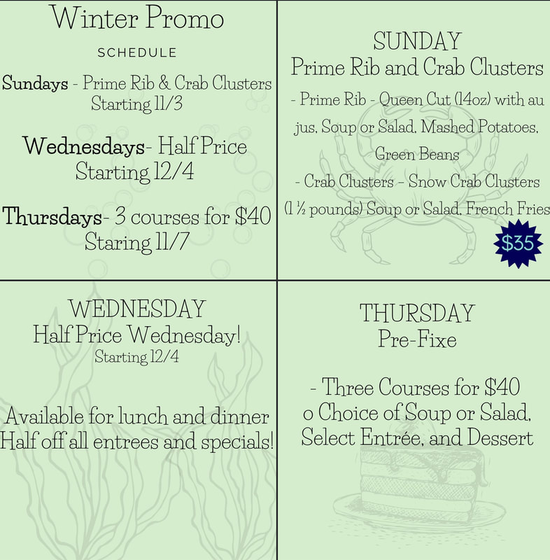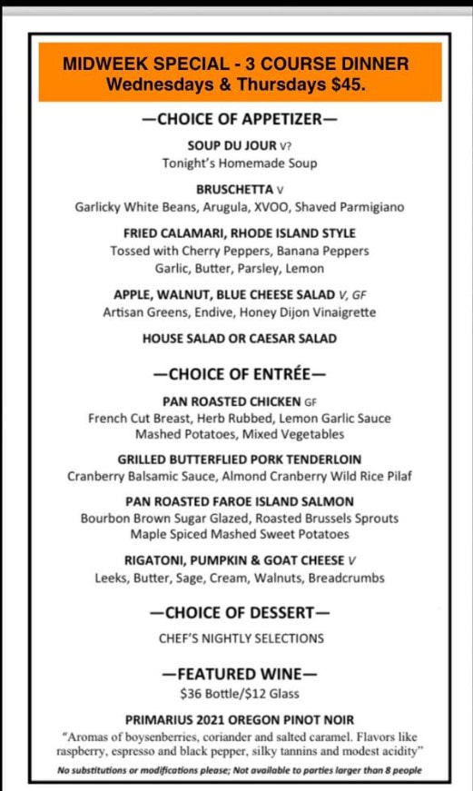 Seagrass* is another local restaurant located on Main Street in Ocean Grove. My husband and I used to come here regularly, but it’s fallen off our radar. Their winter dining promotions include: Prime Rib and Crab Clusters $35, half price Wednesday which covers half off all entrees and specials (call restaurant as in the past this offer was for cash only transactions) and Thursday is a pre-fixe three course meal for $40. I’ve included a screen shot from their Facebook page.