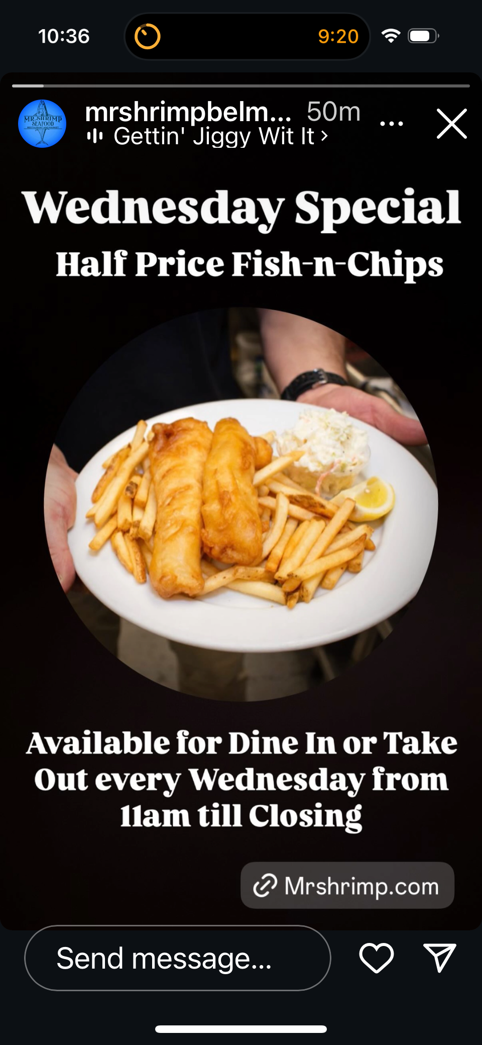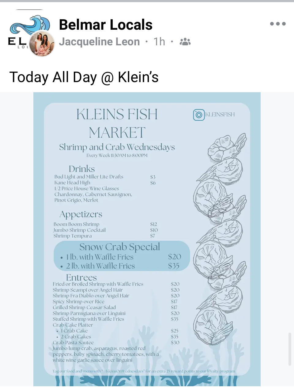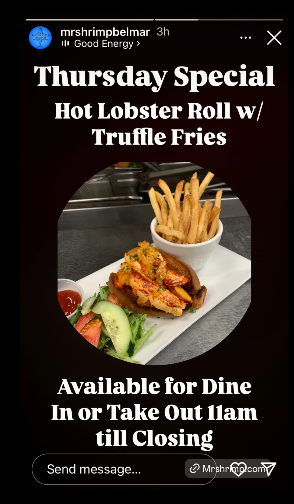 Mr. Shrimp in Belmar has lunch specials from 11 AM to 3 PM. Prices range from $9.99 to $12.99 and include fries or onion straws. Wednesday evenings they offer half price fish-n-chips (regularly $19.99). The offer is available starting at 11 AM.  Thursday Mr. Shrimp offers hot lobster roll with truffle fries (pricing not mentioned in Instagram ad).