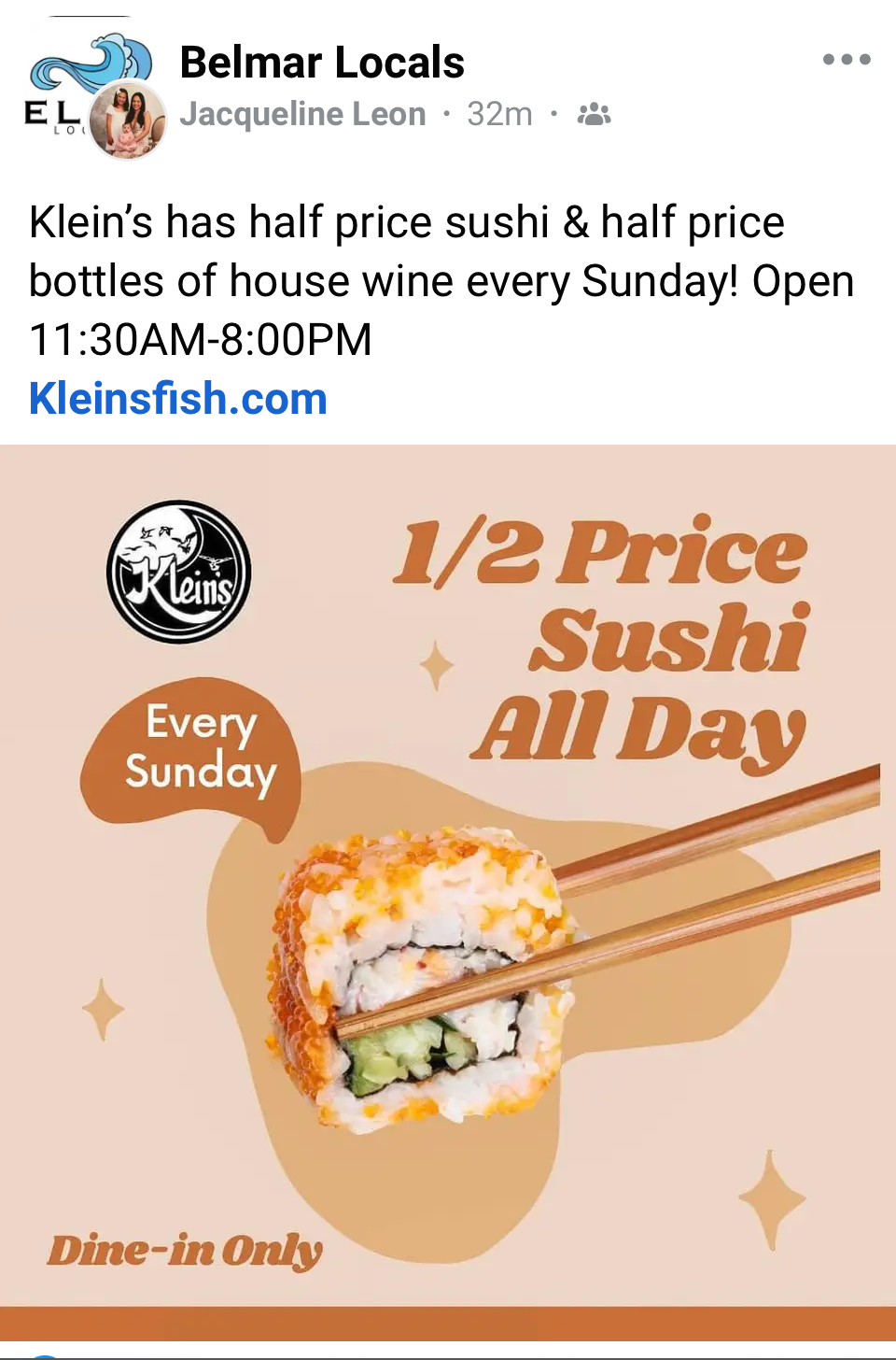 Recently posted on Facebook was Klein’s Fish Market* and their Sunday special (dine-in only) for 1/2 price sushi. They also offer a happy hour menu at the bar Wednesday to Friday from 3-6 PM.