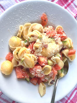 This recipe is very refreshing during the summer as it takes advantage of summertime tomatoes and green zucchini. There is no sauce, just the vegetables, freshly grated Parmesan cheese and mozzarella. The pasta is just baked until heated through. It was a lovely change from our normal pasta with tomato sauce. It does take approximately an hour from start to finish to prepare this dish as you need to dice the zucchini and sauté them. The tomatoes need to be peeled and diced. I went one step further and seeded the tomatoes. I believe it will be worth your effort to try this dish. If you’re looking to utilize seasonal, fresh vegetables and get your fill of pasta, this recipe is for you. My husband and I enjoyed the change.