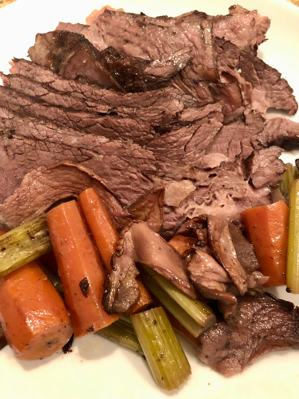 After 2-1/2 hours or so, check the beef with a meat thermometer. When its internal temperature reaches 180°-it should be easily pierced with a fork--take the pan from the oven. Remove the meat to a platter, with intact carrot and celery pieces to serve as a garnish.
