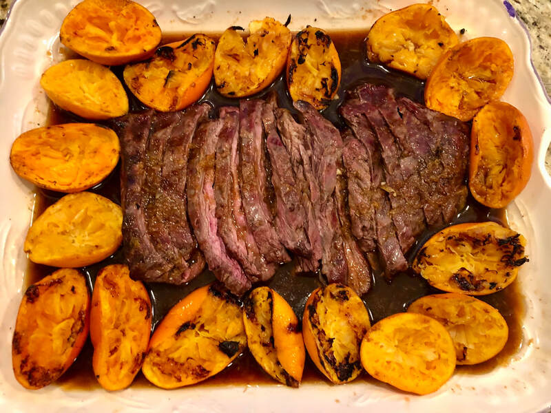 If you don’t use all six oranges, the balance are placed on a sheet pan along with the Bavette and coated with neutral oil. I grilled the Bavette over a medium-high to high heat, five minutes per side or until the internal temperature reached125° on a meat thermometer. While the meat cooked, the orange halves are placed on the grill to be charred. When done, the meat is placed on a deep serving platter with the citrus sauce. The charred oranges are squeezed with tongs to release their juice into the sauce. Let the steak rest from five to 30 minutes before slicing.