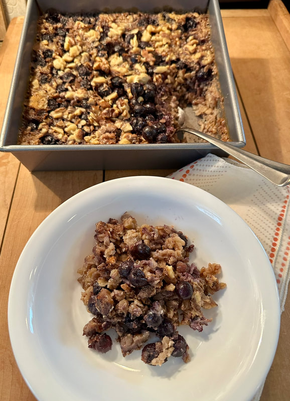 The portions of Ms. Heuck’s recipe are slightly less than Ms. Clark’s and bakes in an 8-inch x8-inch baking pan. Similarly, milk, egg, brown sugar, maple syrup, melted butter and vanilla are combined. In the dry ingredients, the baking powder, cinnamon and salt are combined with the oatmeal. The mixture is poured into a buttered pan with the nuts and fruit on top.