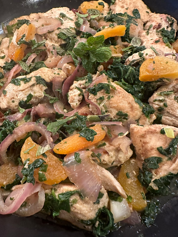 The chicken is tossed with grated ginger, cumin, coriander and salt. The onion is thinly sliced and cooked in olive oil just until softened. The chicken is added to the pan and cooked until browned on both sides. Next, the apricots are added to the pan as the chicken finishes cooking. Wine is added to the pan as well as additional grated ginger. The mixture is stirred while scrapping up the fond on the bottom of the skillet. Lastly, spinach is added and cooked until wilted. Adjust the salt and sprinkle with mint before serving.