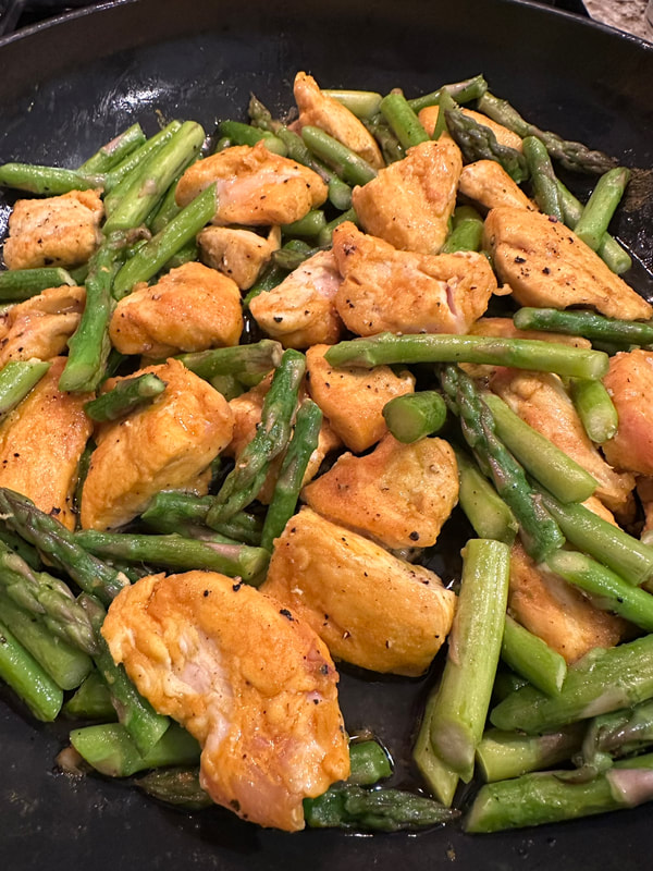 In a 10-inch non-stick skillet, over medium-high heat, oil is added to the pan and the chicken is cooked until browned on both sides. The asparagus is then added to the pan, seasoned with salt and cooked just until crisp tender. The honey sauce is poured over as the chicken finishes cooking and the sauce thickens. Off heat, a splash of vinegar is added and seasoning adjusted. You can add fresh lime juice over top.