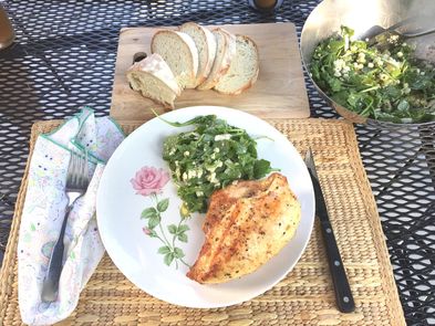 The chicken was brushed with EVOO and seasoned with salt and pepper before going on the grilled. For the salad, there was a refreshing citrus vinaigrette that topped the peppery arugula and corn. It took about 45 minutes of prep and cook time to prepare this terrific summertime meal. The sweetness of the corn played off wonderfully with the arugula. Instead of using grated Pecorino Romano cheese, I used shavings of Parmesan Reggiano cheese, which is less salty than the Pecorino. All in all, both my husband and I enjoyed our light supper.