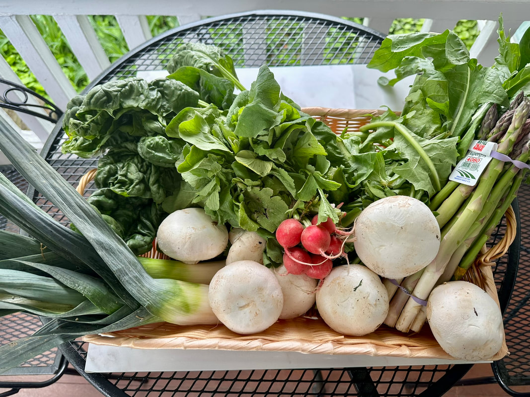 Last Tuesday was the first week of our Dreyer Farm CSA program. The program ends just before Thanksgiving. In our first box, we were loaded with plenty of greens which included a four-pack of lettuce, asparagus, romaine lettuce, mushrooms, parsley, spinach, leeks, radishes and dandelion greens. As I share this box with my daughter, we either split items if it’s a large quantity or trade off whole items with each other. This week I took the dandelion greens and split the lettuce pack, asparagus, mushrooms, spinach, leeks and radishes.