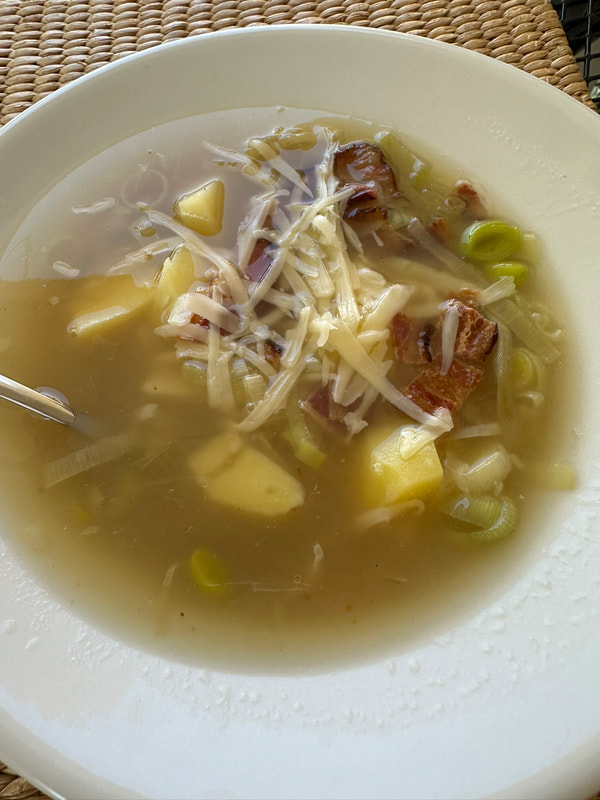 The potatoes were cut into 1-inch chunks and added to the pot along with the stock. The mixture is seasoned with salt and pepper and cooked until the potatoes are tender, yet not breaking apart. Two cups of the potatoes and a cup of stock are removed to either a food processor or blender and pulse until the potatoes are liquified. The puree is poured back into the pot along with the leek and seasonings adjusted. To serve, pour into bowls and garnish with crumbled bacon and grated cheese.