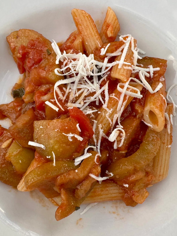 As it was my granddaughter’s birthday dinner, she requested Pasta alla Norma. I found a recipe on the website “Serious Eats” by J. Kenji López-Alt. For this recipe you’ll need extra-virgin olive oil, small Italian or Japanese eggplants, kosher salt, garlic cloves, dried oregano, red pepper flakes, tomato paste, whole peeled tomatoes, either penne rigate or rigatoni pasta, fresh basil land ricotta salata.
