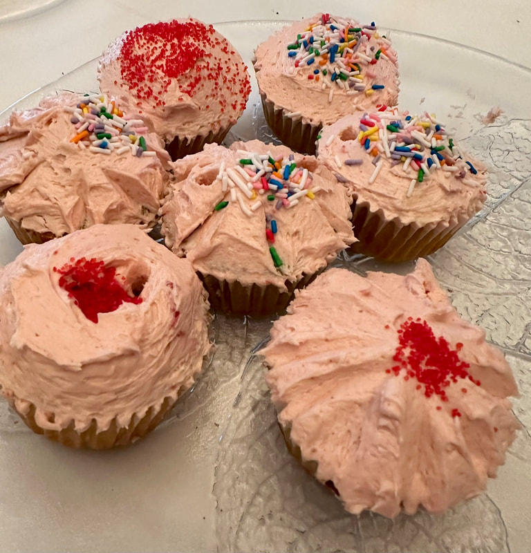 During my daughter’s family’s last days at the beach, she invited another family to join them. My daughter was going to get pizza from Pizzeria Lucci in Belmar, therefore, I only needed to prepare a salad and my granddaughter’s request for cupcakes. I found a recipe, by Yossy Arefi, on The New York Times/NYT Cooking website for Vanilla Cupcakes. This recipe yields a mere dozen, which was perfect. For the recipe you’ll need, all-purpose flour, granulated sugar, baking powder, baking soda, fine salt, unsalted butter, buttermilk, eggs, neutral oil and vanilla extract. The buttercream frosting needs either lemon juice, lemon extract or vanilla extract for flavoring and heavy cream or milk. Since my granddaughter requested strawberry frosting, I pulsed dried strawberries in my mini food processor which I added to the frosting.