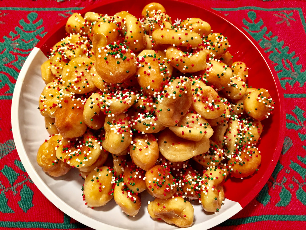 A former client of mine, Dolores, had a craving for struffoli (Italian honey balls) for Christmas. Dolores is a delightful, spry late 80ish woman and I wanted to surprise her with this holiday favorite. I made the recipe twice, once for Dolores and once for my daughter. Both of them were thrilled to receive this holiday treat.