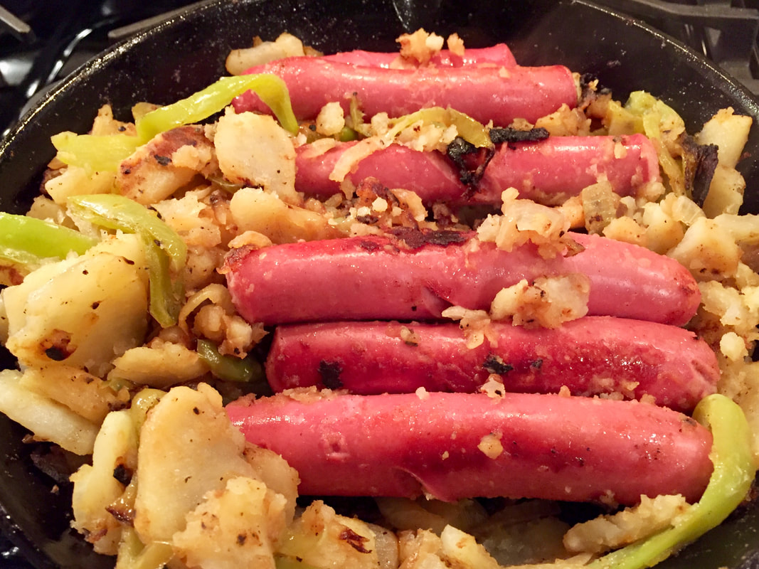 For Christmas Eve dinner, my husband and I wanted something super easy, Dickie Dee Italian style hot dogs. So what is an Italian style hot dog? Fried peppers, onions, potatoes and hot dog on half of an Italian pizza bread. Don’t knock it until you try it! We haven’t had these in ages, so the splurge on fried food was delicious. I didn’t try to find pizza bread that the hot dogs are served on, so I used sperlonga bread from Whole Foods. For the potatoes I used russets that I peeled, par boiled and chilled before frying. This trick I learned in Gourmet Magazine. This method helps the potato hold their shape and brown up better when they’re fried.