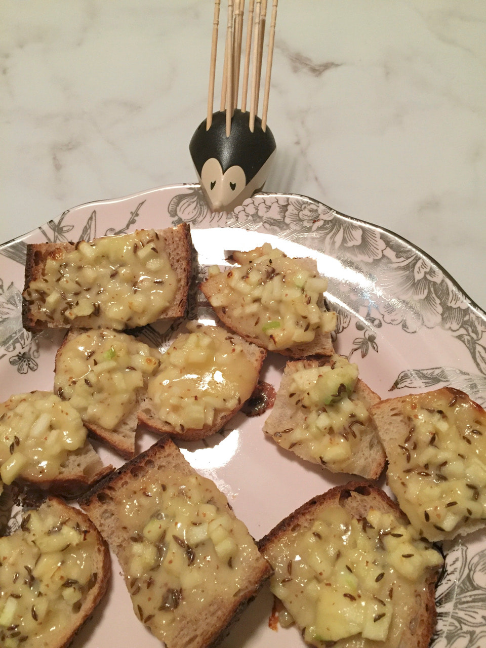 Although I didn’t have to work Christmas Eve, I had a few gifts to wrap, hors d’oeuvres to make and supper. My son requested apple cheddar canapés that came from the September 1988 issue of Gourmet magazine. I made these with a small wheel of Grafton Village 2 year aged cheddar Vermont Raw Milk cheese. This cheese was so creamy when I made mac n’cheese and was delicious when paired with Granny Smith apples in this recipe. The photo above was taken post-Christmas and, therefore, I didn't bother to cut circles of rye bread for my husband and I.